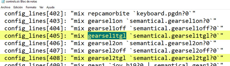 Usa la función de buscar del bloc de Notas para ubicar la linea que dice: "mix gearsel1tgl". La linea completa deberia parecerse a esto: